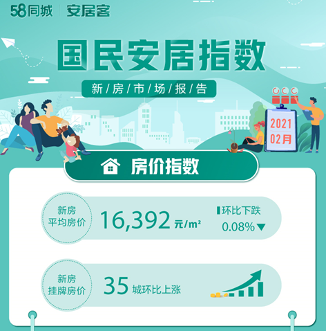經(jīng)濟(jì)日?qǐng)?bào)-中國經(jīng)濟(jì)網(wǎng)北京3月2日訊 近日,58同城、安居客發(fā)布2021年《2月國民安居指數(shù)報(bào)告》。報(bào)告顯示,2021年2月全國重點(diǎn)監(jiān)測(cè)67城新房在線均價(jià)16392元/㎡,環(huán)比下跌0.08%,其中有35城新房在線均價(jià)環(huán)比上漲;二手房在線掛牌均價(jià)16011元/㎡,環(huán)比上漲0.93%,全國67城中有60城二手房掛牌均價(jià)出現(xiàn)環(huán)比上漲情形;購房者信心指數(shù)持續(xù)上漲,2月達(dá)到117.5,環(huán)比上漲7.7%;經(jīng)紀(jì)人信心指數(shù)為113.7,環(huán)比上漲1.8%。