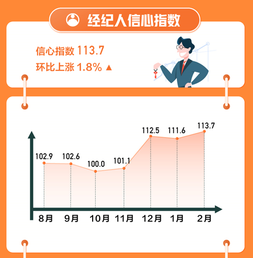 2月份大連、石家莊和杭州等地購房者更愿意與經(jīng)紀(jì)人溝通,其中大連微聊數(shù)據(jù)環(huán)比上漲16.1%。2021年2月經(jīng)紀(jì)人信心指數(shù)為113.7,環(huán)比上漲1.8%;56%的經(jīng)紀(jì)人認(rèn)為會(huì)繼續(xù)調(diào)控抑制房價(jià)上漲。
