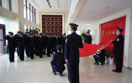 幼兒園小朋友在園內(nèi)舉行升旗儀式。