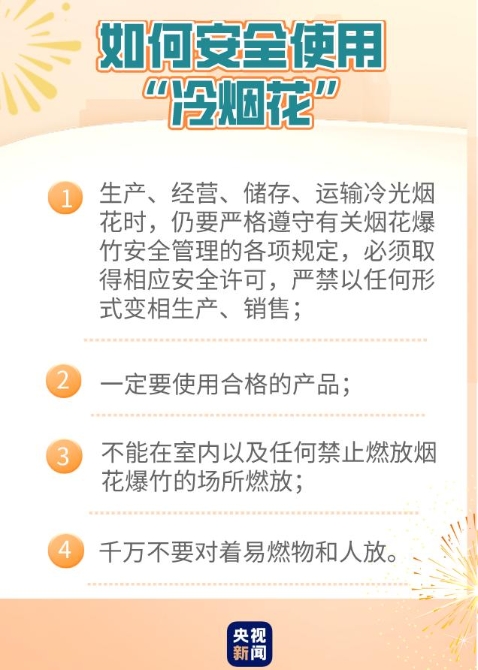在生產(chǎn)、經(jīng)營(yíng)、儲(chǔ)存、燃放“冷煙花”時(shí),仍要嚴(yán)格遵守有關(guān)煙花爆竹安全管理的各項(xiàng)規(guī)定。