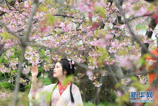 3月3日,游客身著漢服在武漢東湖櫻花園內(nèi)賞花留影。