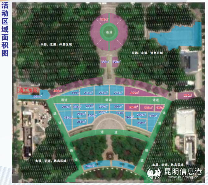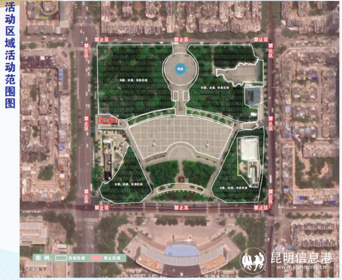 據(jù)西苑街道辦事處發(fā)布的《關(guān)于西山區(qū)碧雞廣場提升精細(xì)化管理水平的通告》(以下簡稱“通告”):碧雞廣場將劃分舞蹈區(qū)、體育鍛煉區(qū)、樂器與棋牌區(qū)等活動區(qū)域,活動區(qū)域內(nèi)可按照相關(guān)規(guī)定開展文化體育活動。廣場外沿綠化帶以外至街對面建筑物滴水線為禁止區(qū)域(含廣場外圍人行道),禁止區(qū)域內(nèi)嚴(yán)禁開展文體活動、擺攤設(shè)點(diǎn)及其他一切影響道路暢通的行為。