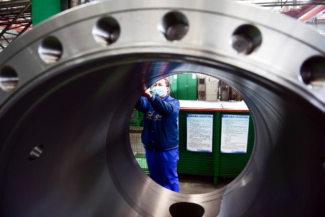 2020年2月10日,沈陽(yáng)鼓風(fēng)機(jī)集團(tuán)股份有限公司工人在生產(chǎn)線上工作。新華社發(fā)(沈鼓集團(tuán)提供)