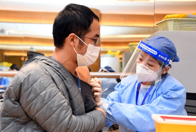 2月22日,在北京市海淀區(qū)中關(guān)村軟件園二期一家企業(yè)內(nèi)的臨時(shí)接種點(diǎn),醫(yī)務(wù)人員為企業(yè)員工接種新冠疫苗。新華社記者 任超 攝