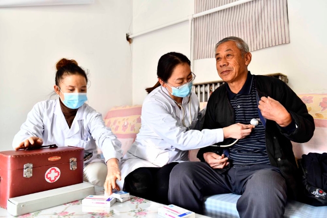 2020年11月11日,在山東省濰坊市寒亭區(qū)寒亭街道東院社區(qū),衛(wèi)生室醫(yī)生王紅霞(中)為村民張勇臣看病。寒亭區(qū)探索實(shí)施醫(yī)保服務(wù)下沉舉措,構(gòu)建起覆蓋全區(qū)基層醫(yī)療機(jī)構(gòu)的醫(yī)保服務(wù)下沉網(wǎng)絡(luò),讓群眾在家門口便捷地享受醫(yī)保紅利。新華社記者 郭緒雷 攝