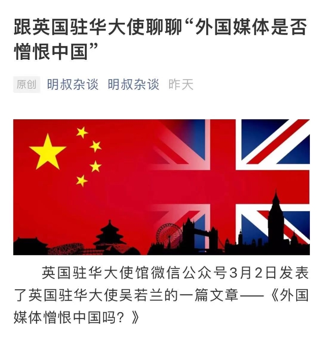 3月3日,微信公眾號“明叔雜談”發(fā)表題為《跟英國駐華大使聊聊“外國媒體是否憎恨中國”》談及該篇文章,也分享了自己的一些看法。文章寫道: