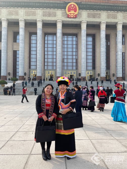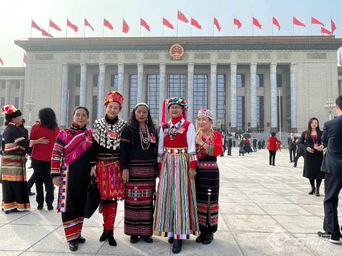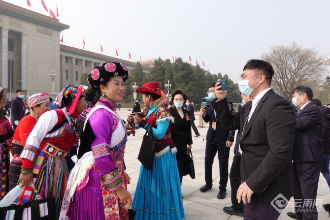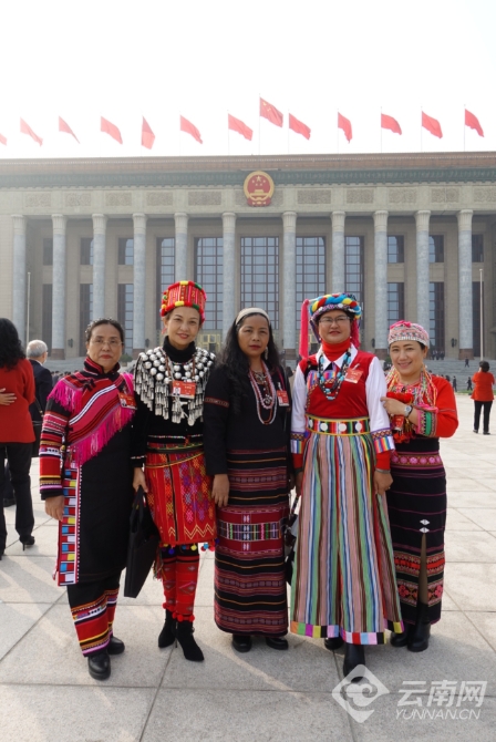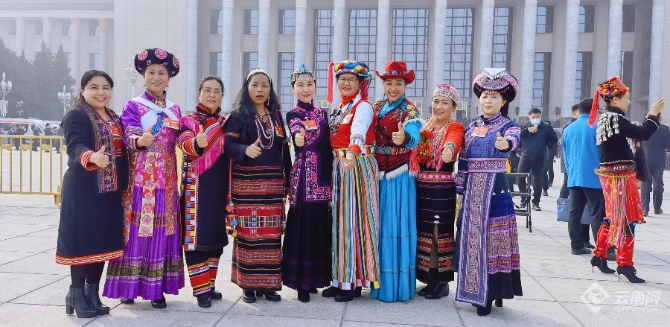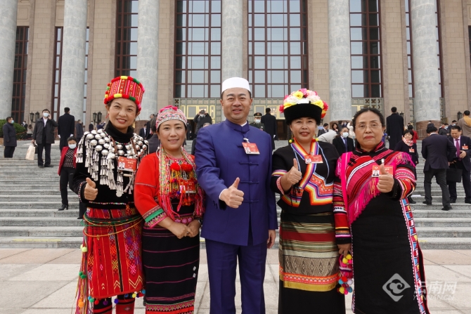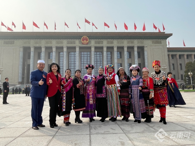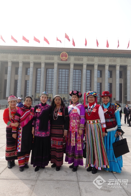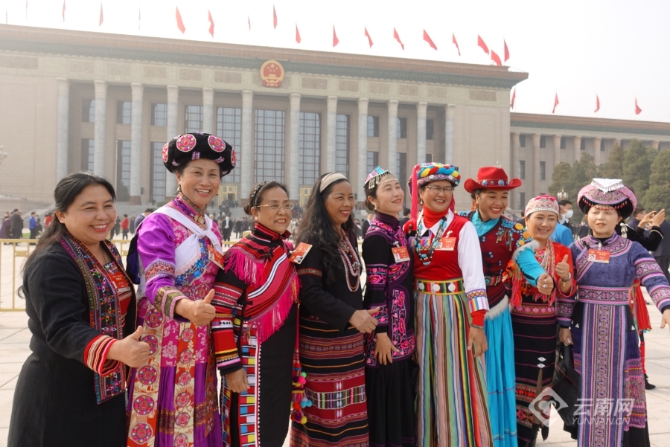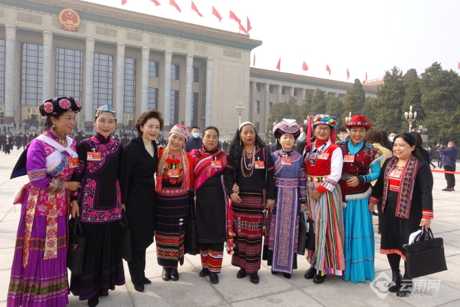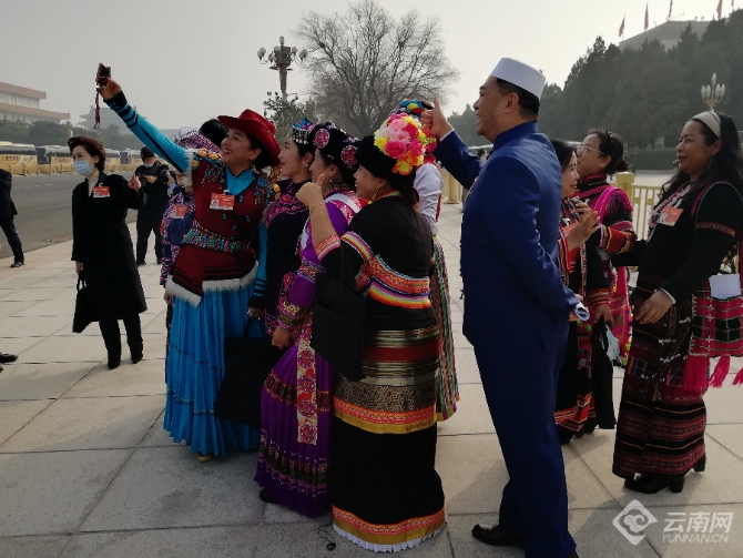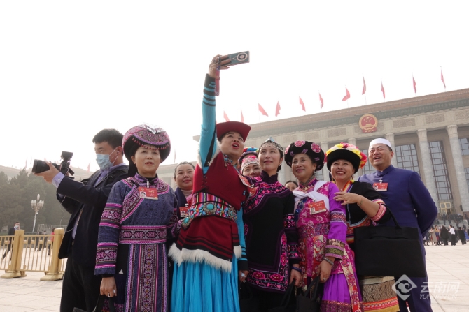 云南網訊 全國政協(xié)十三屆四次會議3月4日下午在北京人民大會堂開幕,住滇全國政協(xié)委員們身著民族服裝參加盛會,成合影搶拍焦點。(云南網)