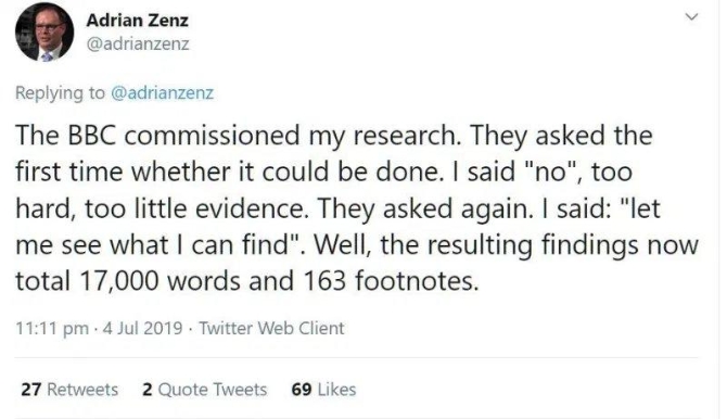 要知道BBC的錢都來自英國的電視觀眾繳納的電視稅,BBC用納稅人的錢,資助一個神學(xué)院出身的假學(xué)者,然后這位神學(xué)院畢業(yè)生用自己炮制的假學(xué)術(shù)成果反哺BBC,進(jìn)而去欺騙英國的電視觀眾和納稅人。這種假新聞生產(chǎn)方式是否是BBC對華報道的專用生產(chǎn)鏈?衛(wèi)報文章在站臺支持BBC的時候,為什么對此視而不見、只字不提呢?