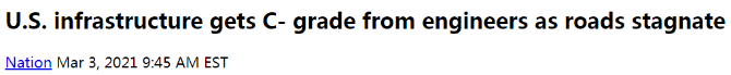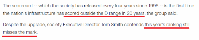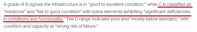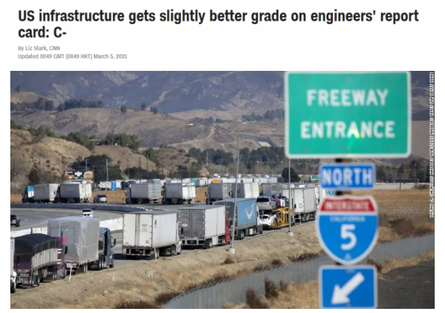 如果按照美國絕大多數(shù)學(xué)校要求通過課程的成績達(dá)到“C”以上的標(biāo)準(zhǔn),“C-”也可在某種程度上被視為“不及格”。堂堂世界第一大經(jīng)濟(jì)體的基礎(chǔ)設(shè)施為何如此不堪呢?