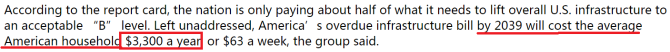 美媒指出,美國迄今只支付了將國內(nèi)整體基礎(chǔ)設(shè)施提升至可接受的“B”級所需費(fèi)用的一半左右。據(jù)ASCE估計(jì),未來十年美國面臨2.59萬億美元的基建投資缺口。如果繼續(xù)無所作為,到2039年,美國逾期未付的基建賬單將導(dǎo)致每戶美國家庭平均每年花費(fèi)3300美元。