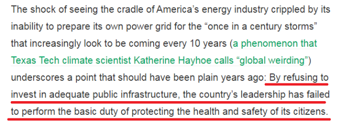 美國科技類博客網(wǎng)站“科技咀嚼網(wǎng)”(TechCrunch)發(fā)文指出,得州發(fā)生的災(zāi)難已經(jīng)讓一個冷酷的事實(shí)變得非常清楚:美國在基礎(chǔ)設(shè)施投資和應(yīng)對氣候變化問題上的失敗,使美國的任何地方在突發(fā)災(zāi)害來臨時都無法幸免?!坝捎诰芙^投資建設(shè)足夠的公共基礎(chǔ)設(shè)施,國家領(lǐng)導(dǎo)層已經(jīng)無法履行保護(hù)公民健康和安全的基本職責(zé)”。