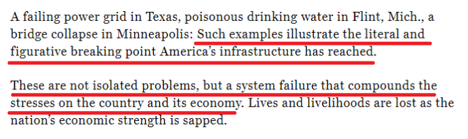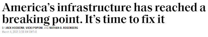 正如《財(cái)富》雜志的評論文章所說,基礎(chǔ)設(shè)施建設(shè)需要協(xié)調(diào)一致并且全力以赴的舉國努力?!暗每怂_斯州癱瘓的電網(wǎng)、密歇根州弗林特的有毒飲用水、明尼蘇達(dá)州明尼阿波利斯的橋梁倒塌等等并不是孤立的問題,而是整個制度的失靈”。(環(huán)球資訊+)