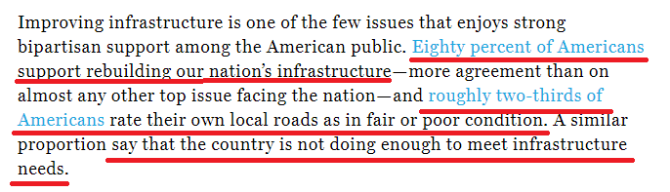 美國《財(cái)富》雜志報道稱,改善基礎(chǔ)設(shè)施是少數(shù)幾個在分別支持兩黨的美國公眾中得到普遍支持的議題之一:大約三分之二的美國人認(rèn)為該國在滿足基礎(chǔ)設(shè)施需求方面做得不夠;而80%的美國人支持重建國家基礎(chǔ)設(shè)施。