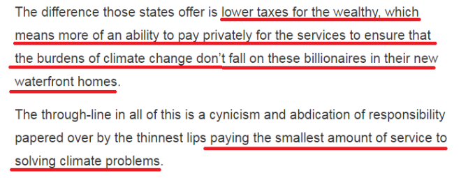 毫無疑問,基礎(chǔ)設(shè)施建設(shè)需要消耗巨額資金,而這需要政府的政策調(diào)整和各方的積極參與,但許多有實(shí)力的投資者并不想承擔(dān)這種社會責(zé)任。有評論文章以得州為例指出,富人們不愿意為應(yīng)對天災(zāi)作出實(shí)質(zhì)性努力,是因?yàn)楫?dāng)?shù)卣恢睂λ麄儾扇《愂諆?yōu)惠政策,而這使他們有能力私下支付相關(guān)服務(wù)費(fèi)用,以確保氣候變化的負(fù)擔(dān)不會“落在自己的海濱別墅上”。