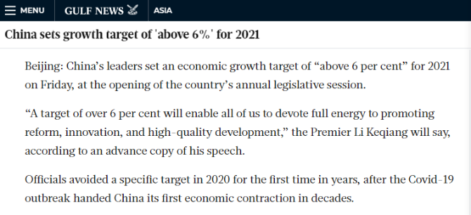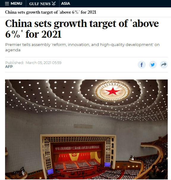 當?shù)貢r間3月5日,阿聯(lián)酋發(fā)行量居首位的英文報紙《海灣新聞》發(fā)表題為《中國為2021年設定經(jīng)濟增長目標為6%以上》的文章,對今年政府工作報告進行了關注。
