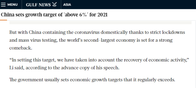 文章表示,5日兩會政府工作報告中宣布,中國在2021年的經(jīng)濟增長目標為6%以上,并強調要努力推動改革、創(chuàng)新和高質量發(fā)展。文章還指出,在全球遭受疫情沖擊的背景下,中國采取的抗疫舉措卓有成效,作為全球第二大經(jīng)濟體,中國經(jīng)濟有望持續(xù)復蘇。