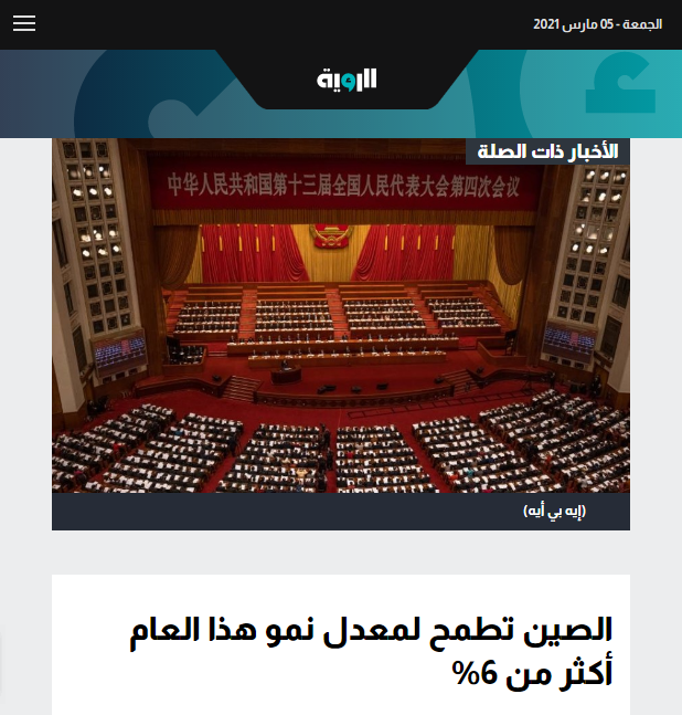 3月4日,中國兩會啟幕。2021年是中國共產(chǎn)黨成立100周年,也是實施“十四五”規(guī)劃、開啟全面建設社會主義現(xiàn)代化國家新征程的開局之年。中國的經(jīng)濟發(fā)展與世界息息相關,中東多國媒體密切關注了中國2021經(jīng)濟增長目標、綠色發(fā)展、科技創(chuàng)新、脫貧等相關內容。
