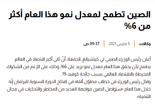 另外,阿聯(lián)酋知名阿拉伯語報紙《觀點報》在也當天發(fā)表題為《中國希望今年經(jīng)濟增長率超過6%》的文章,對今年兩會進行了報道。