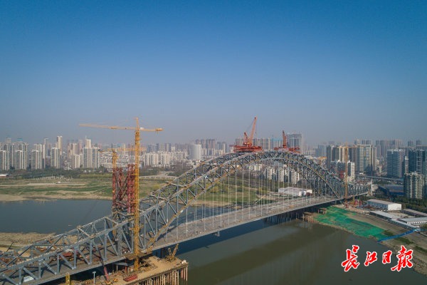 漢江灣橋建設(shè)現(xiàn)場(chǎng) ,工人們正在緊張施工。 長(zhǎng)江日?qǐng)?bào)記者任勇 航拍