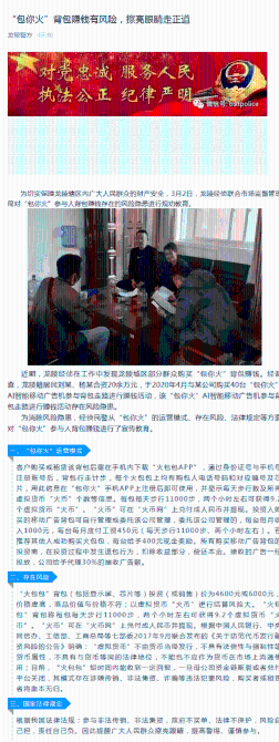 經(jīng)公安機(jī)關(guān)研判,“包你火”“火包包”短時(shí)間確實(shí)能收到一定回報(bào),一旦母公司資金鏈斷裂,購(gòu)買(mǎi)者或租賃者將血本無(wú)歸。該模式存在涉嫌非法傳銷(xiāo)、非法集資、非法吸收公眾存款、詐騙等違法犯罪風(fēng)險(xiǎn)。