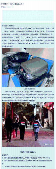 這份違法風(fēng)險(xiǎn)提示稱(chēng),近期, 云南省多地出現(xiàn)群眾背著以6000元一個(gè)購(gòu)買(mǎi)或向他人租借的“包你火”或“火包包”礦機(jī)包,該種包包全名叫AI智能廣告礦機(jī),其結(jié)構(gòu)為:一個(gè)雙肩包面嵌著一塊電子顯示屏,播放屏背面是一塊電子集成器連接著一個(gè)充電寶,電子顯示屏上顯示相關(guān)廣告內(nèi)容,如:“包你火”“火包包”“XX歡迎您”等廣告。