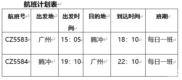 廣州-騰沖航線每日一班,去程航班號CZ5583,15:05從廣州白云機場起飛,18:10抵達騰沖駝峰機場;回程航班號CZ5584,當天19:10從騰沖駝峰機場起飛,22:10抵達廣州白云機場。
