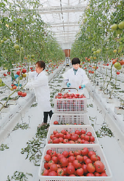 在浙江省湖州市德清縣阜溪街道龍勝村的水木莫干山都市農(nóng)業(yè)園區(qū)內(nèi),工人正在智能溫室采摘西紅柿。謝尚國(guó)攝(人民圖片)