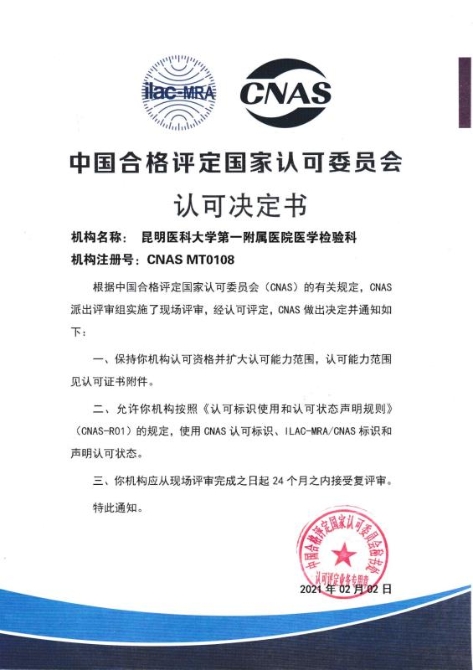 決定書明確,保持昆醫(yī)大附一院檢驗科認(rèn)可資格并擴(kuò)大認(rèn)可能力范圍;允許按照《認(rèn)可標(biāo)識使用和認(rèn)可狀態(tài)聲明規(guī)則》的規(guī)定,使用CNAS認(rèn)可標(biāo)識、ILAC-MRA/CNAS標(biāo)識和聲明認(rèn)可狀態(tài)。本次評審新增了新型冠狀病毒核酸檢測項目的認(rèn)可,使該院醫(yī)學(xué)檢驗科成為全國首批、云南首家通過該項目認(rèn)可的實驗室。