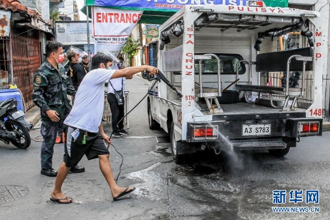 3月11日,工作人員在菲律賓馬尼拉一處村口的檢查站為通過的警車消毒。新華社發(fā)(烏馬利攝)