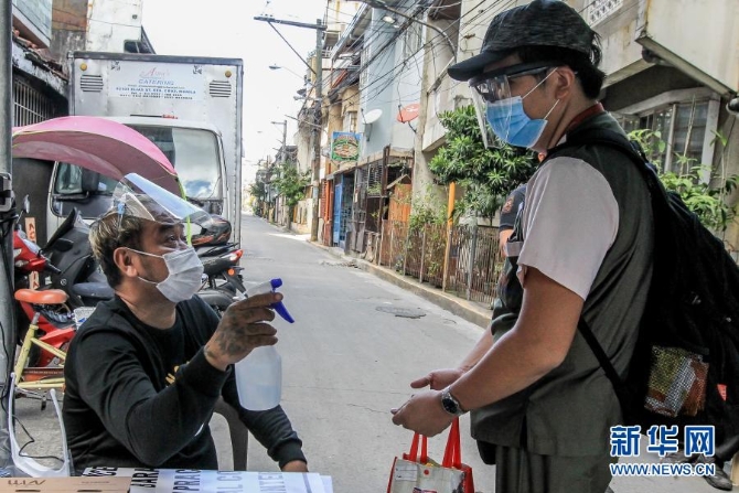 3月11日,一名工作人員在菲律賓馬尼拉一處村口的檢查站為過往的居民噴消毒液。新華社發(fā)(烏馬利攝)