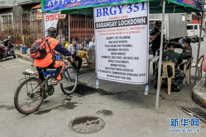 3月11日,一名居民通過菲律賓馬尼拉一處村口的檢查站。新華社發(fā)(烏馬利攝)