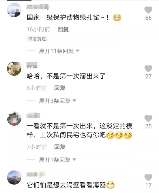 動管科的工作人員稱,孔雀出逃逛街的情況時有發(fā)生。小家伙們?nèi)缃褚呀?jīng)很熟悉附近的環(huán)境,待它們逛夠了之后便會自行返回動物園,市民們不必過于擔(dān)心。