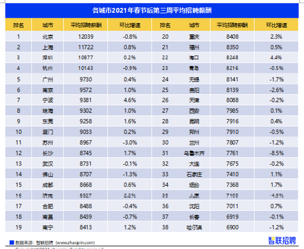 在全國(guó)38個(gè)核心城市中,北京、上海、深圳、杭州依然占據(jù)全國(guó)薪酬領(lǐng)先地位,其中上海、深圳兩地的薪酬較上一周還有小幅上漲趨勢(shì)。從薪酬增速角度來看,寧波、??谄骄衅感匠暝诠?jié)后第三周分別環(huán)比上升4.6%、4.4%,重慶(2.3%)、濟(jì)南(2.2%)、煙臺(tái)(1.7%)、長(zhǎng)沙(1.7%)緊隨其后。其中,昆明環(huán)比上升0.4%,平均招聘薪酬為7916元/月。