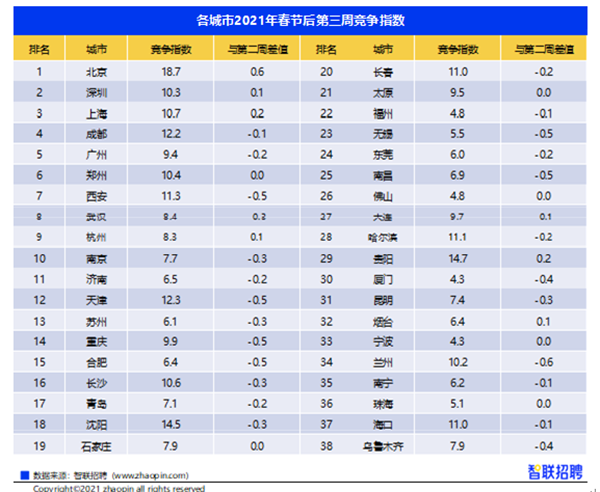 全國(guó)38個(gè)核心城市中,北京招聘職位數(shù)占比與上一周持平,而求職端增長(zhǎng)快,帶動(dòng)競(jìng)爭(zhēng)指數(shù)上漲0.6至18.7,穩(wěn)居全國(guó)第一,招聘規(guī)模環(huán)比擴(kuò)張的還有深圳、成都與鄭州。