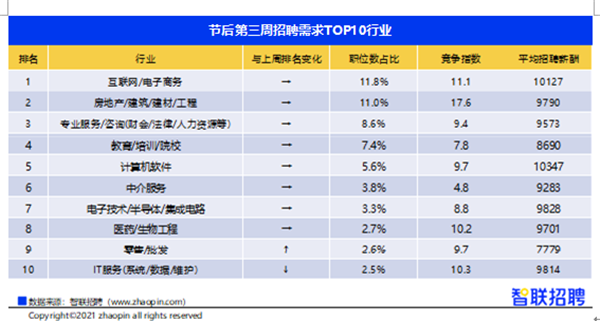 在人才供需方面,春節(jié)后第三周,招聘需求規(guī)模最大的行業(yè)依然是互聯(lián)網(wǎng)/電子商務(wù)和房地產(chǎn)/建筑/建材/工程,分別占11.8%、11%。此外,招聘需求TOP10行業(yè)也與上周一致,僅存在位次差別,其中專業(yè)服務(wù)/咨詢(財(cái)會(huì)/法律/人力資源等)與計(jì)算機(jī)軟件人才需求略有擴(kuò)張,而零售/批發(fā)行業(yè)則在榜單中上升一個(gè)位次來到第九名。