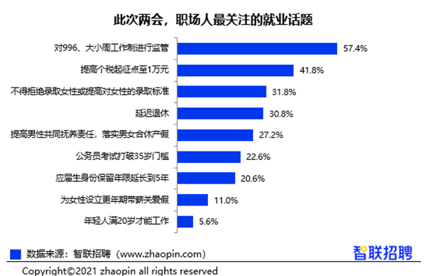 調(diào)研中,呼吁監(jiān)管996、大小周工作制度的提案發(fā)布后激發(fā)職場(chǎng)人對(duì)過勞現(xiàn)象的聲討,57.4%受訪者表示關(guān)注。此外,41.8%關(guān)心提高個(gè)稅起征點(diǎn)的問題,“不得拒絕錄取女性或提高對(duì)女性的錄取標(biāo)準(zhǔn)”與“延遲退休”也均獲得超過3成的關(guān)注。(云南網(wǎng) 記者楊萍)