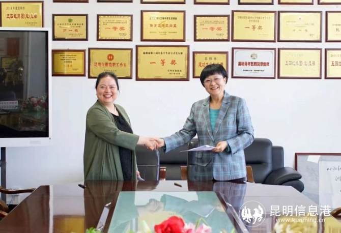 昆明市藝術(shù)學(xué)校校長李琪(圖右)、靳麗芬教授簽署聘用協(xié)議