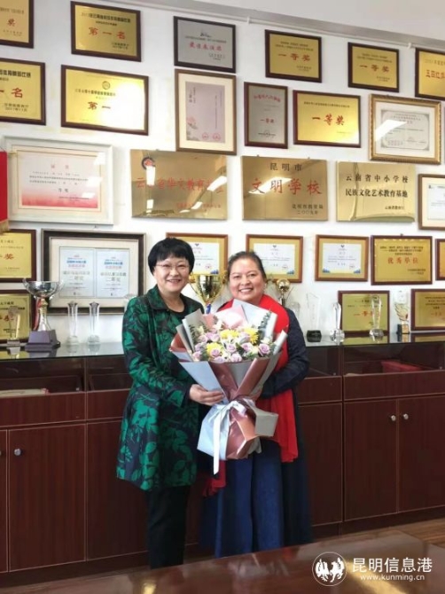 昆明市藝術(shù)學(xué)校校長李琪(圖左)向靳麗芬教授贈送鮮花