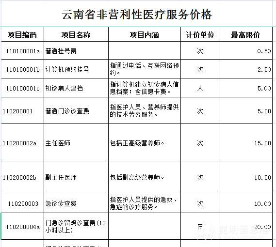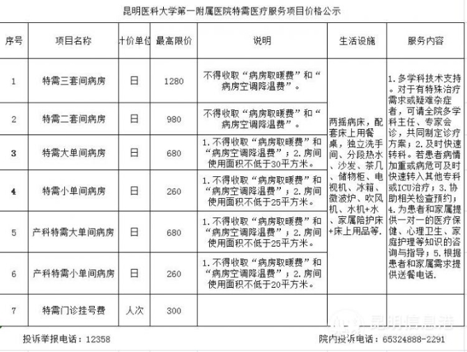 在云大醫(yī)院官網(wǎng)“醫(yī)療收費(fèi)價(jià)格公示”版塊,有一份發(fā)布于2018年7月的《昆明醫(yī)科大學(xué)第一附屬醫(yī)院特需醫(yī)療服務(wù)項(xiàng)目價(jià)格公示》,其中顯示特需門診掛號費(fèi)每人次300元;另外一份公示《云南省非營利性醫(yī)療服務(wù)價(jià)格》顯示普通門診診查費(fèi)每次5元,主任醫(yī)師每次15元,副主任醫(yī)師每次10元。