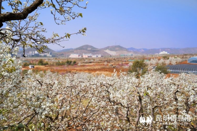 從昆明市區(qū)出發(fā),驅(qū)車30余公里,導(dǎo)航來到萬溪沖。在進(jìn)入梨園的萬溪沖社區(qū),擺滿了各種各樣的小攤,豌豆粉、酸梨、各類蔬菜……來往游客絡(luò)繹不絕。繼續(xù)前行1.5公里左右,來到山頂眺望,這里居然藏了一片“白色海洋”,漫山遍野的梨花,如團(tuán)團(tuán)云絮,微風(fēng)拂過,落英繽紛,充滿著春天的詩情畫意與盎然生機(jī)。