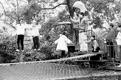 上海和平公園內(nèi),孩子們在勇敢者樂園里參加體育冒險游戲,感受運動快樂,鍛煉身體素質(zhì)。陳玉宇攝/光明圖片