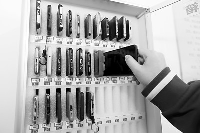 河北工業(yè)大學附屬紅橋中學的學生將手機放入管理箱準備上課。劉東岳攝/光明圖片