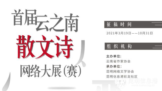 首屆云之南散文詩網(wǎng)絡(luò)大展(賽)由云南省作家協(xié)會(huì)主辦,昆明網(wǎng)絡(luò)文學(xué)協(xié)會(huì)、昆明信息港彩龍社區(qū)承辦,征稿時(shí)間為2021年3月19日至10月31日,本土作者(包括工作、生活或就讀于云南),旅居省外、海(境)外的云南籍(裔)作者均可參加。