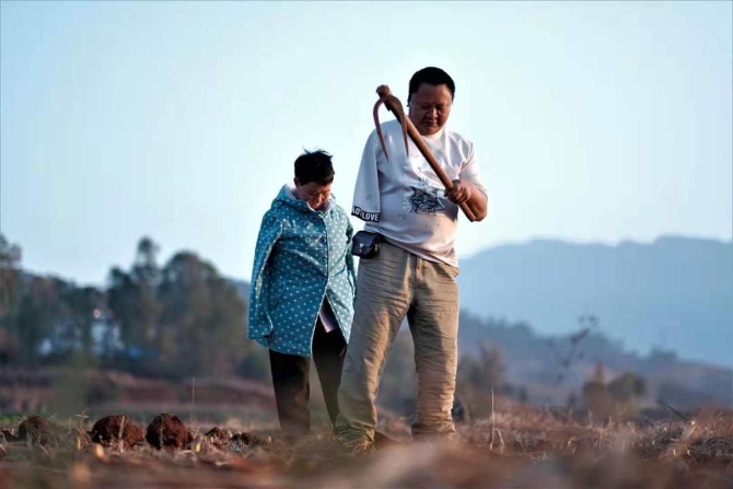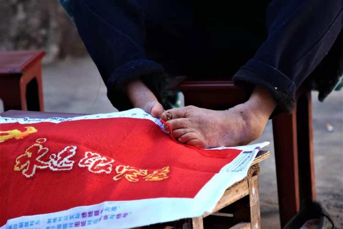 死了娃娃可憐,兩口子哭完,咬咬牙還得干。張順東說,別人掉幾顆汗珠能干完的活,我們得濕幾層衣裳、多磨出幾個(gè)血泡才行。天剛亮倆人就下地了,種玉米張順東在前面刨坑,李國(guó)秀后面下種;收玉米丈夫在前面掰,妻子背著簍在后面接。在娘家沒切過菜的李國(guó)秀,練起了雙腳基本功。慢慢的,她雙腳能切菜、能繡花、能下種:雙腳穿針引線,繡出的花像真的;芝麻粒大小的菜籽,她能用腳趾夾起來。