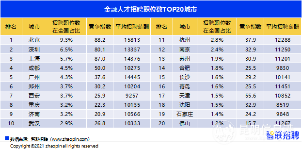 整體來看,我國(guó)金融人才招聘需求地域分布較為均勻,在招聘需求最高的20個(gè)城市中,北京占到9.3%,深圳與上海分別以6.5%、5.7%緊隨其后。成都躋身人才需求第四名,領(lǐng)先廣州0.2個(gè)百分點(diǎn)。