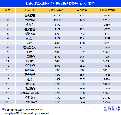 智聯(lián)招聘近日發(fā)布《2021年金融業(yè)求職指南》,聚焦銀行業(yè)、證券業(yè)、保險(xiǎn)業(yè)、信托業(yè)四大細(xì)分領(lǐng)域主要業(yè)務(wù)崗位的人才供需狀況、薪酬水平、企業(yè)招聘要求等。其中指出,基金、信托業(yè)的高薪光環(huán)吸引人才涌入,2020年股市基金熱推動(dòng)操盤手人才需求上漲33.3%,銀行業(yè)數(shù)字化轉(zhuǎn)型勢(shì)頭強(qiáng)勁,對(duì)數(shù)據(jù)、AI(人工智能)人才需求環(huán)比分別增長(zhǎng)1.6、1.3倍。