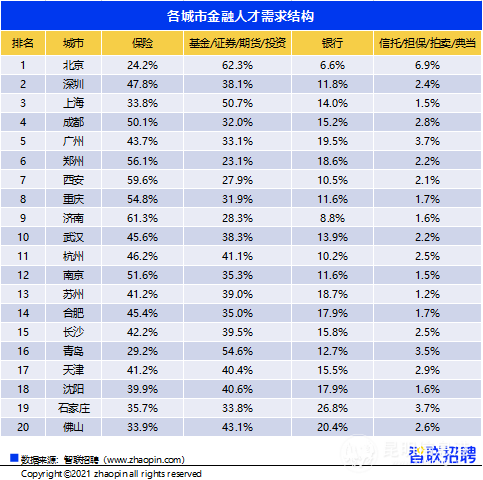 在金融人才招聘需求前20名城市中,北京、上海的金融人才需求中基金/證券/期貨/投資行業(yè)占比最高,分別達(dá)到62.3%和50.7%,而以深圳、成都、廣州為首的多數(shù)城市,招聘更多的是保險(xiǎn)業(yè)人才。在銀行業(yè)人才需求規(guī)模上,廣州、鄭州、合肥、沈陽有著相對(duì)更高的占比。