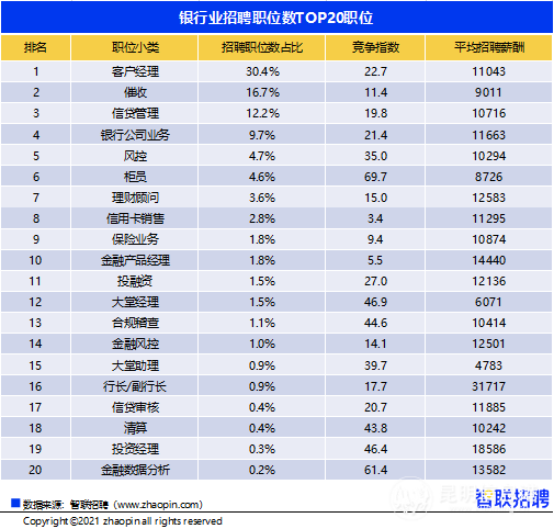 銀行業(yè)招聘需求中客戶經(jīng)理占比超3成,合規(guī)稽查、金融風(fēng)控、信貸審核、清算等后臺(tái)崗位的招聘需求排名也整體靠前。而金融業(yè)與互聯(lián)網(wǎng)的接軌,帶動(dòng)金融產(chǎn)品經(jīng)理進(jìn)入銀行業(yè)核心招聘職業(yè)TOP20。該崗位對(duì)金融與互聯(lián)網(wǎng)的知識(shí)技能有著剛性要求,14440元/月的薪酬也很豐厚,僅次于18586元/月的投資經(jīng)理。金融產(chǎn)品經(jīng)理競(jìng)爭(zhēng)較為緩和,平均有5.5人爭(zhēng)搶一職。