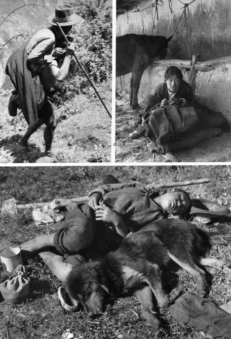 上圖左:西藏農(nóng)奴制度下的“人背人”(即農(nóng)奴像牲畜一樣背馱著農(nóng)奴主)差役。上圖右:和牲口同住的農(nóng)奴。下圖:農(nóng)奴益西欽沛服勞役后與犬同眠。(新華社發(fā))