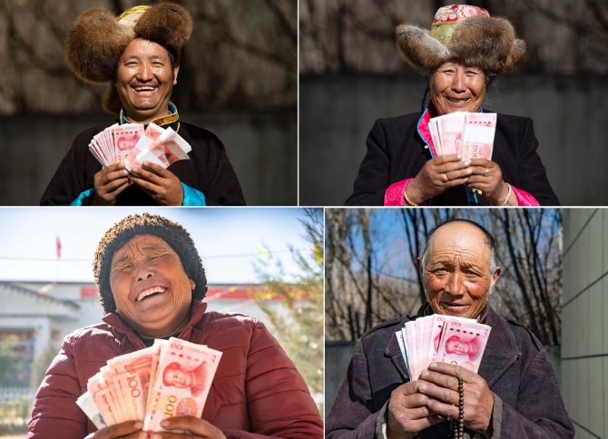 2月9日,領(lǐng)到分紅的克松社區(qū)居民興高采烈。(新華社記者普布扎西攝)